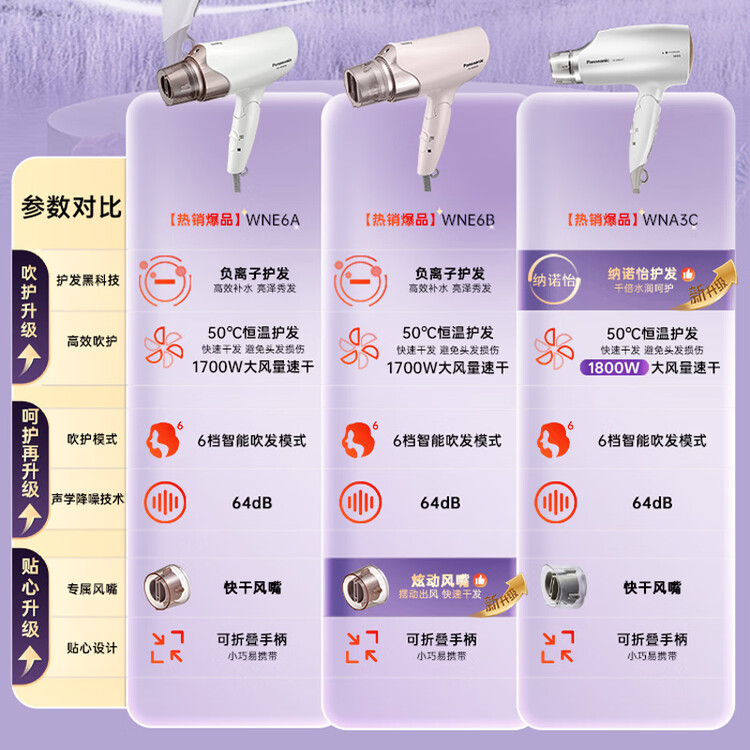 松下(Panasonic)负离子电吹风机筒高速大功率不伤发家用低噪速干护发送女友生日礼物粉色EH-WNE6B