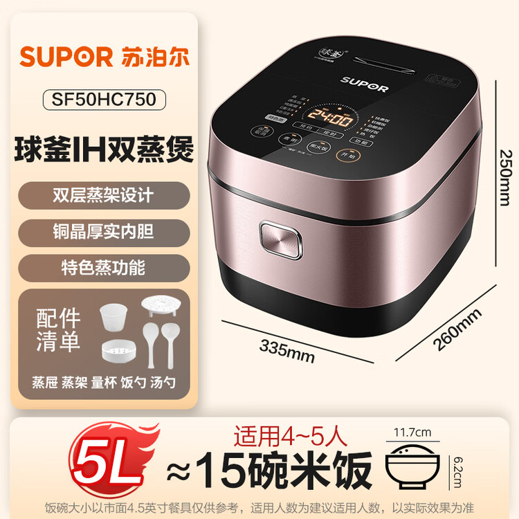 苏泊尔(SUPOR)电饭煲4-5人大容量5升IH加热球釜柴火饭电饭锅上蒸下煮家用智能预约微压电饭锅SF50HC750
