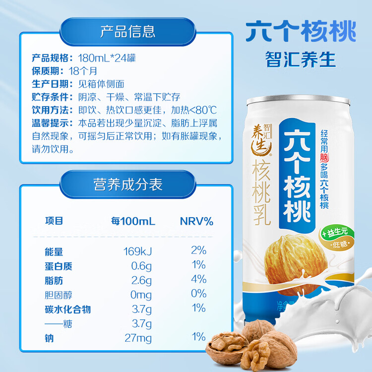 京东直供新 > 水饮冲调 >饮料 >京东直供 >养元六个核桃智汇养生型180ml*24罐量贩实惠核桃乳饮料 整箱装