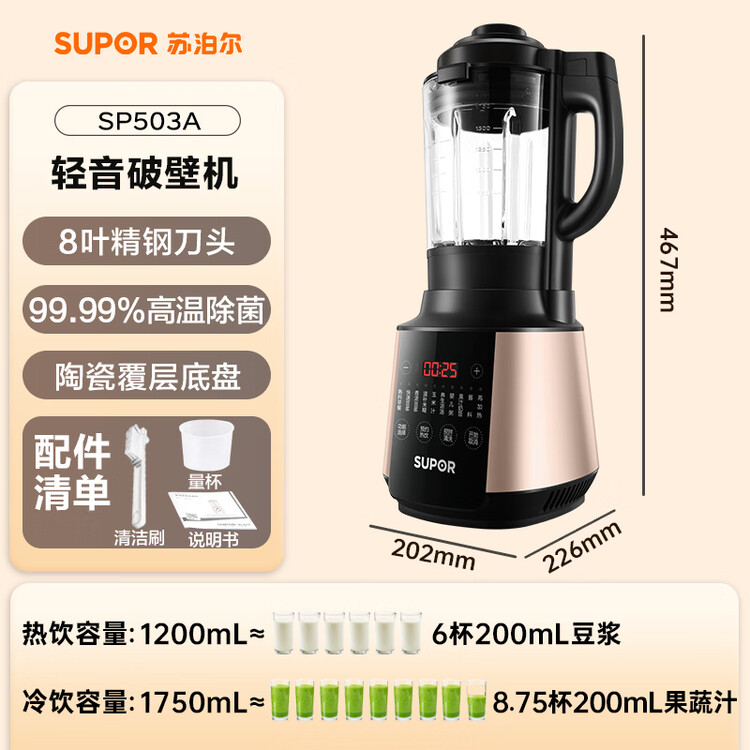 苏泊尔(SUPOR)破壁机 1.75L大容量家用多功能可预约辅食料理机 加热免滤全自动豆浆机 破冰碎冰榨汁机SP503A