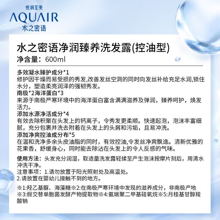 水之密语(AQUAIR)净润臻养(控油型)洗发水套装600ml*2滋养保湿男女士洗头膏
